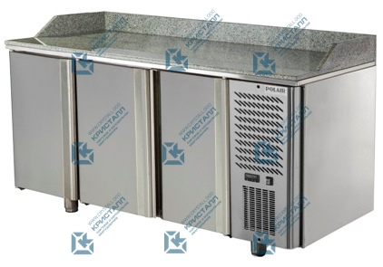 С трех сторон рабочая поверхность стола ограничена гранитными бортами высотой 150 мм. Такая конструкция позволяет удобно разместить на столах охлаждаемую витрину для ингредиентов (топингов), не занимая при этом пространства столешницы и не мешая работе пиццайоло.