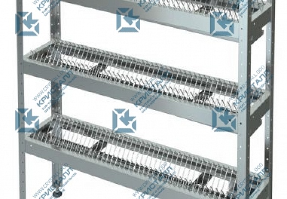 Полки стеллажа для тарелок С-Т изготовлены из нержавейки t=0,5 AISI 430, каркас оцинкованный, стойки-уголок, решетка из проволоки диам. 5 мм