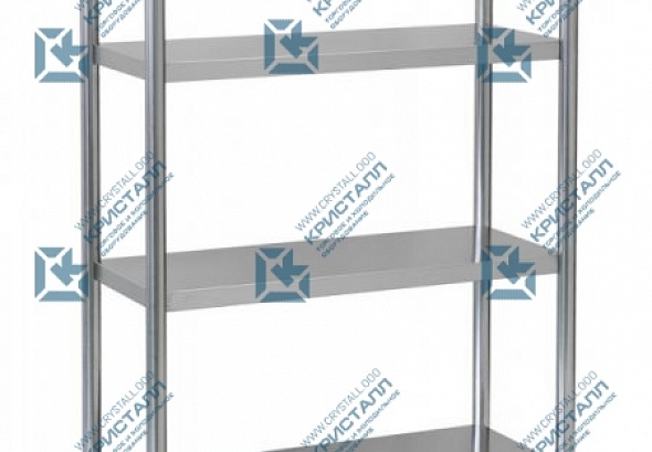 Стеллаж состоит из стоек, изготовленных из круглой трубы Ф40 мм, и четырех полок. Полки и стойки стеллажа выполнены из пищевой нержавеющей стали и могут устанавливаться на разных уровнях.
