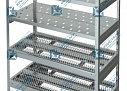 Полки стеллажа универсального СУ изготовлены из нержавейки t=0,5 AISI 430, 1 сплошная, 2 решетчатые, 2 полки для тарелок, каркас оцинкованный, стойки-уголок
