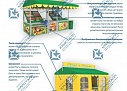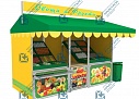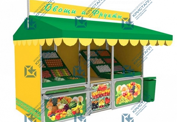 Павильон «Овощи-фрукты» предназначен для торговли соответствующей продукцией, уложенной в ящики. Каркас павильона, оснащённая наклонными и горизонтальными витринами, сборно-разборный, выполнен из оцинкованной стали. В комплектации «закрытый» павильон от дождя и солнца сверху павильон защищен тентом. Также дополнена вертикальными тентами по периметру павильона (3550х1750), что позволяет создавать «защищенное» пространство для торговли и декоративно закрывать павильон по окончании работы. Материал тентов — Оксфорд. «Дверь» в задней части закрывается на молниях. Передняя часть по окончанию работы закрывается наглухо. Все вертикальные тенты при необходимости, могут легко быть свернуты и закреплены под крышей.