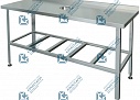 Столешница столов изготовлена из «нержавеющей» стали AISI 430 t=0,5мм. Она укреплена с внутренней стороны листом ламинированной древесностружечной плиты, что увеличивает прочность и исключает прогиб столешницы. В центре столешницы имеется отверстие, под которым помещается ёмкость для сбора отходов. Каркас оцинкованный, стойки-уголок