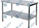 Каркас столов состоит из стоек, выполненных из нержавеющей трубы диаметром 40мм. Стол имеет сплошную полку, также изготовленную из пищевой нержавеющей стали.