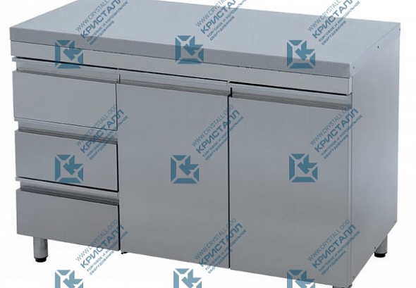 1/3 внутреннего объема стола занимают выдвижные ящики, а 2/3 — отведено под вместительное отделение с распашными дверцами, предназначенное для хранения посуды и сухих продуктов. Размер ящика позволяет установить в нем стандартные гастроемкости GN-1/1. Размер гастороемкости GN-1/1: 530х325х100 мм.