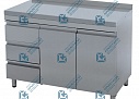 1/3 внутреннего объема стола занимают выдвижные ящики, а 2/3 — отведено под вместительное отделение с распашными дверцами, предназначенное для хранения посуды и сухих продуктов. Размер ящика позволяет установить в нем стандартные гастроемкости GN-1/1. Размер гастороемкости GN-1/1: 530х325х100 мм.