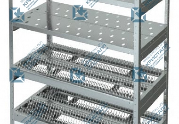 Полки стеллажа универсального СУ изготовлены из нержавейки t=0,5 AISI 430, 1 сплошная, 2 решетчатые, 2 полки для тарелок, каркас оцинкованный, стойки-уголок