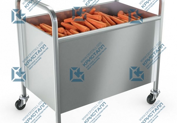 Тележка для овощей ТО-100 предназначена для накопления полностью очищенных на столах овощных СО-1/1200/800 или СО-2/1500/800 овощей и транспортировки их к месту использования. Конструкция: сварная (сталь AISI304); 1 колесная опора с тормозом; Крышка поставляется в комплекте; Размер бункера: 800х500х450 мм. Дно тележки оснащено отверстием для слива воды