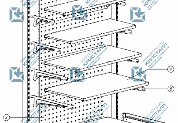 Комплектуется одинарными и двойными крючками длиной 150, 200, 250, 300 и 600 мм, которые устанавливаются на перфорированных панелях стеллажа.